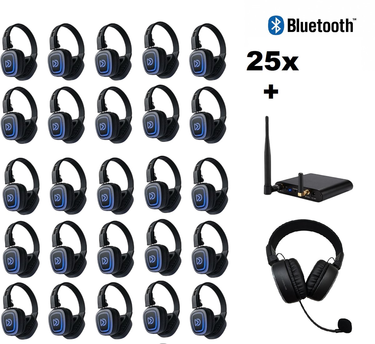 Dolly Digital© Silent Disco Pro Box 25x complete Pro set met 25 koptelefoons, wireless headmounted Microfoon, Bluetooth zender en Professionele Storage box.