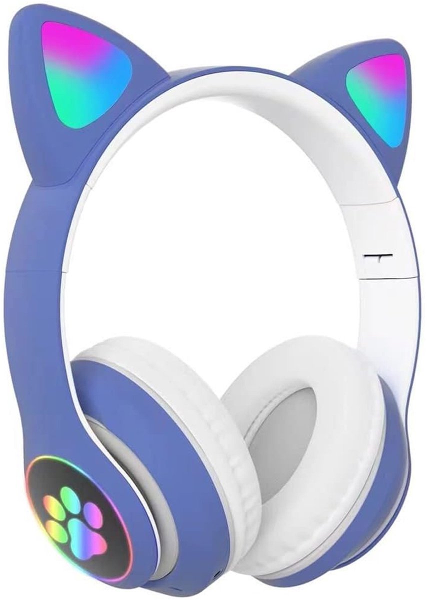 Moderne kinderheadphones met Bluetooth over-ear ontwerp en schattige kattenoortjes. De ingebouwde RGB-leds veranderen van kleur tijdens het luisteren naar muziek, waardoor de headphones een magische uitstraling krijgen. Deze betoverende kleuren maken ze perfect voor dagelijks gebruik, maar ook ideaal als accessoire voor verkleedfeestjes of thema-evenementen.