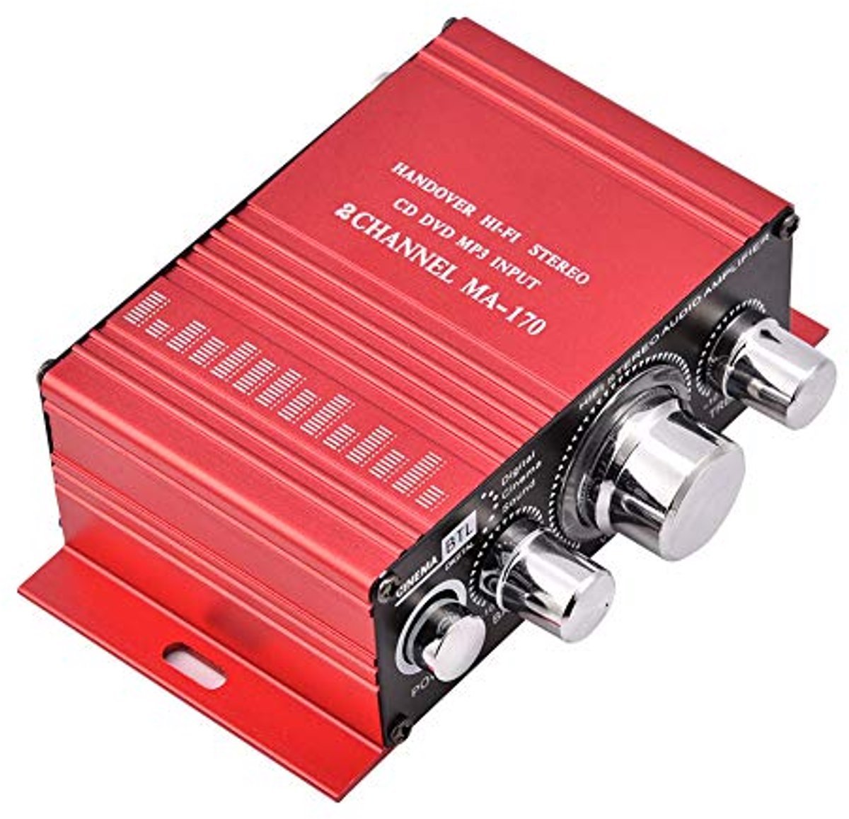 The whole shell is made of aluminum alloy, to eliminate all kinds of electromagnetic interference. By using a powerful audio amplifier chip, the output power is 20 W + 20 W. Suitable for no more than 6 inches and impedance of 4-8Ω 20W speakers. Two pairs of speaker output clips, easy to wire. Support high and low frequency.