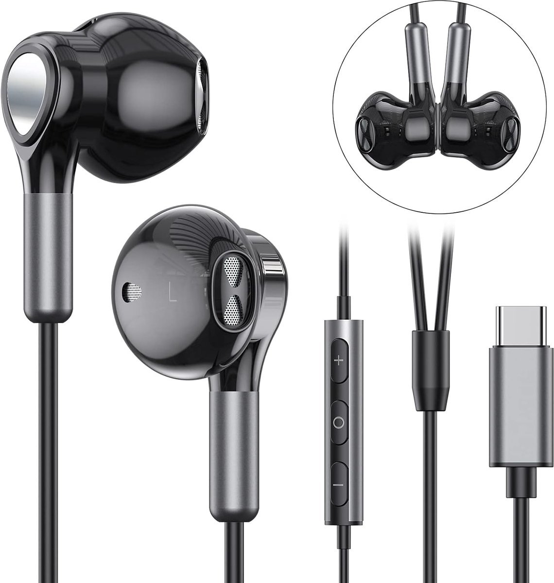 Één paar hoogwaardige USB-C oordopjes gemaakt van zacht siliconen en duurzaam kabelmateriaal met leder-achtige coating. Met geïntegreerde DAC chip en 10 mm drivers voor premium HiFi geluidskwaliteit, passieve geluidsisolatie en gebruiksgemak dankzij microfoon en afstandsbediening. Ideaal voor bellen, muziek en reizen.