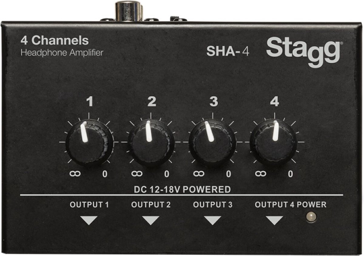 Wanneer je met meerdere mensen met professionele koptelefoons naar dezelfde geluidsbron wilt luisteren, bijvoorbeeld in de studio, dan kan je gebruikmaken van de Stagg SHA-4: een 4-kanaals stereo koptelefoonversterker met individuele volumeknoppen voor ieder kanaal. Sluit de SHA-4 aan door middel van een RCA-kabel of 6.3 mm jack-kabel op de geluidsbron en schakel de gewenste luistermodus in (stereo of mono). De SHA-4 is uitgevoerd met vier 6.3 mm stereo koptelefoonuitgangen.