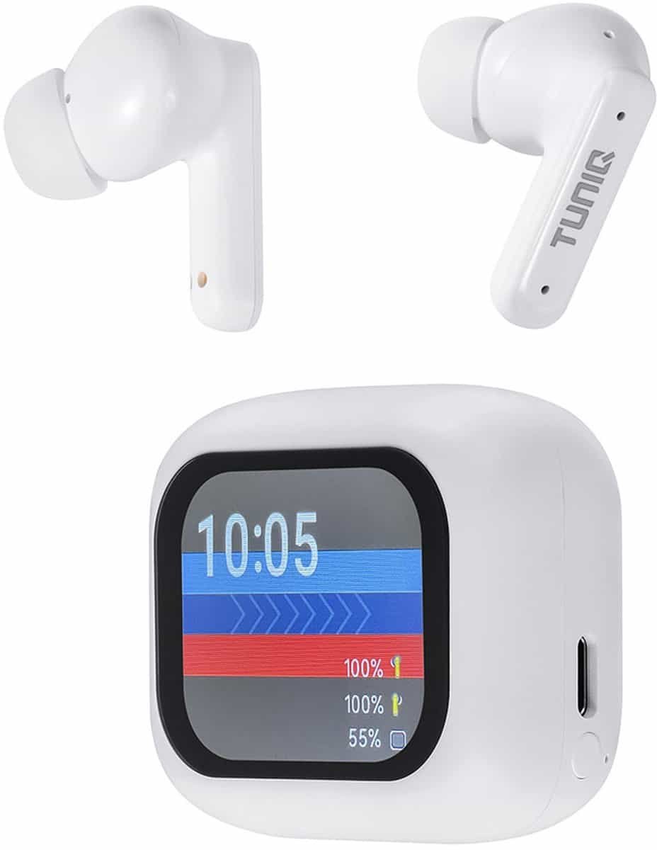 De TUNIQ Wireless Earplugs hebben een minimalistisch wit design met oordopjes met steel en siliconen tips. De bijgeleverde charging case heeft een kleurendisplay dat de tijd en het batterijniveau toont, wat ze ideaal maakt voor bellen, reizen en sport.